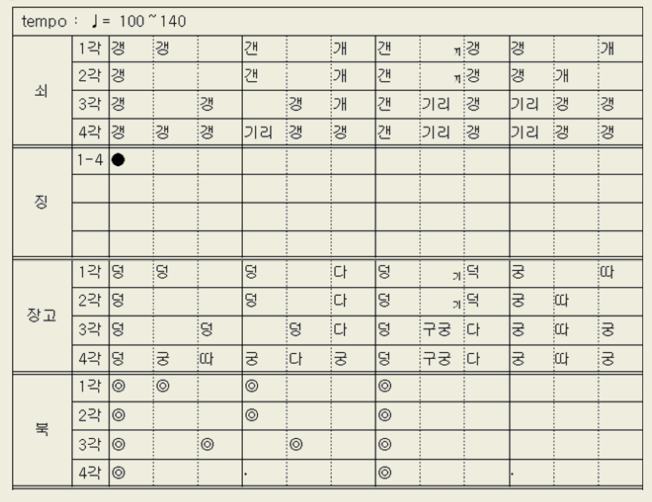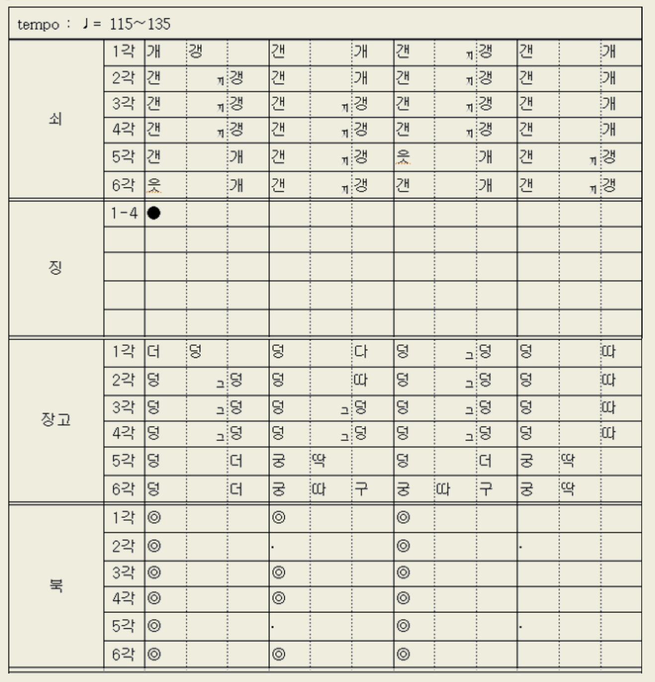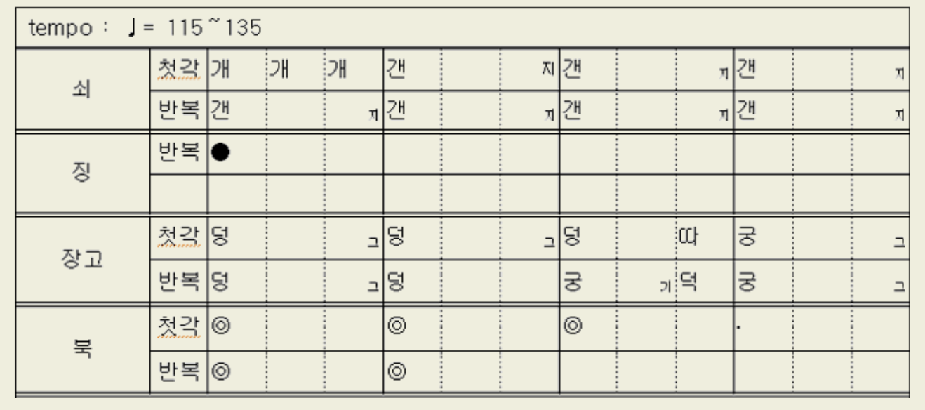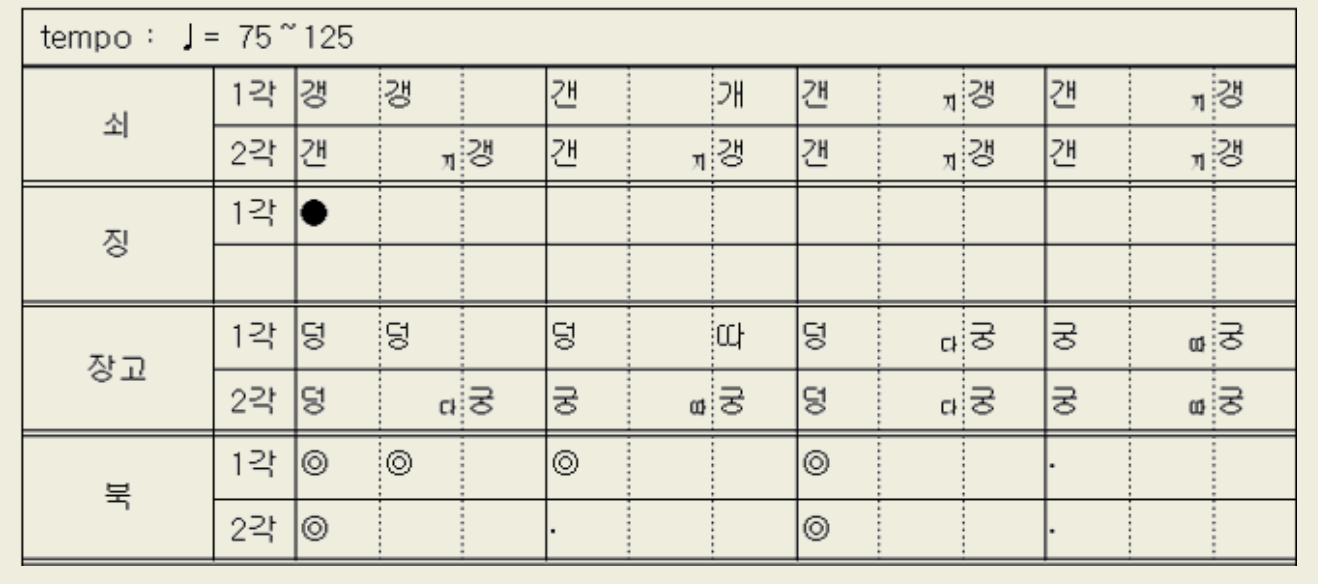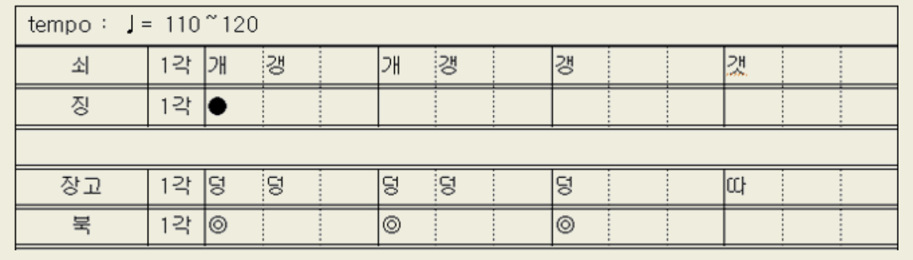 질굿 가락에서 빠르기의 변화를 줄 때는 3각에서 변화를 주며, 4각의 질굿 본가락은 부쇠는 원박을 충실히 이행하고, 상쇠는 변주 가락을 많이 연주한다. 질굿 가락을 맺고자 할 때는 1각으로 되돌아가 반각을 친 다음 느린 갠지갱 또는 빠른 갠지갱가락을 치고 맺이가락으로 넘어가 휘모리가락으로 맺는다.