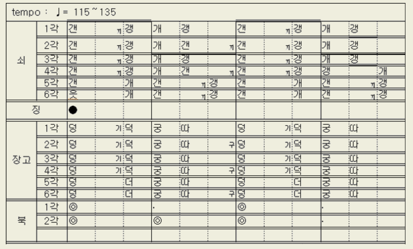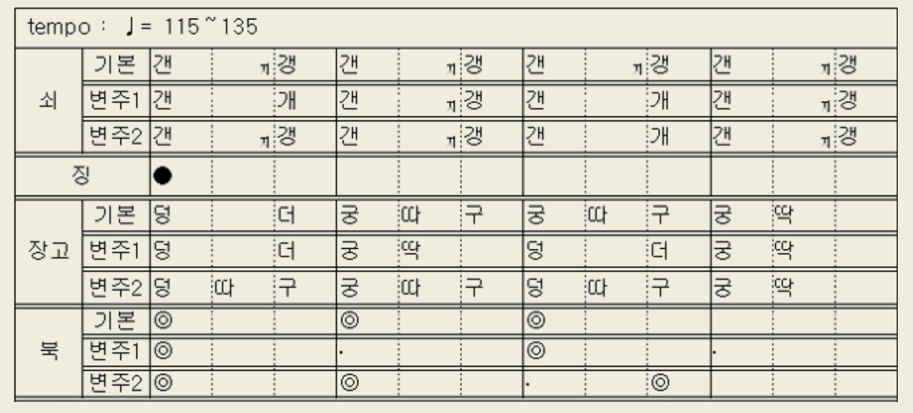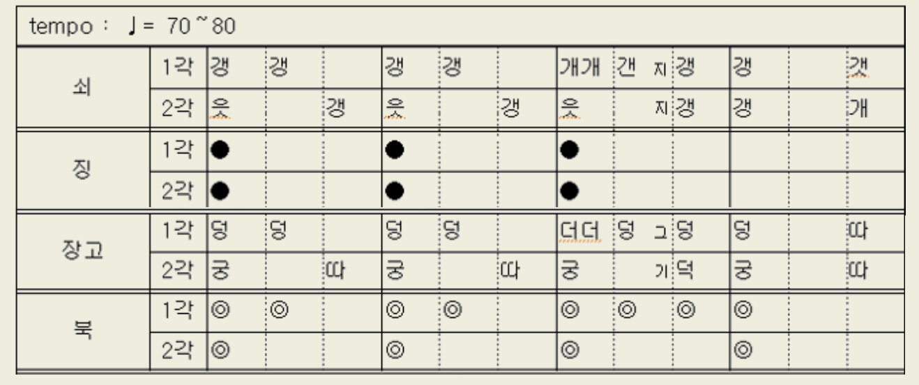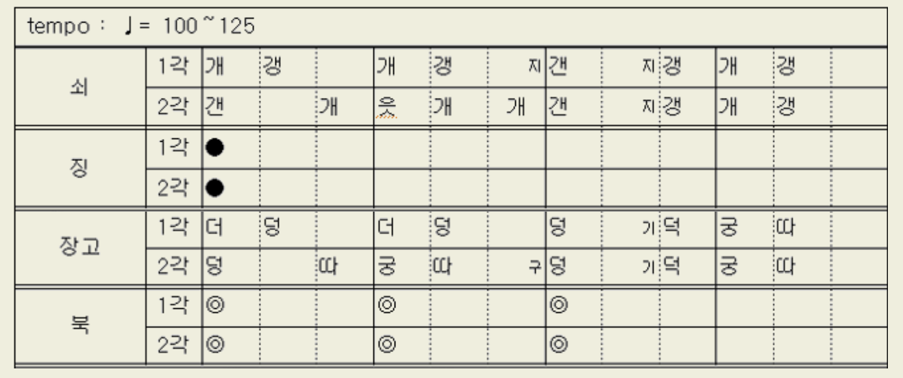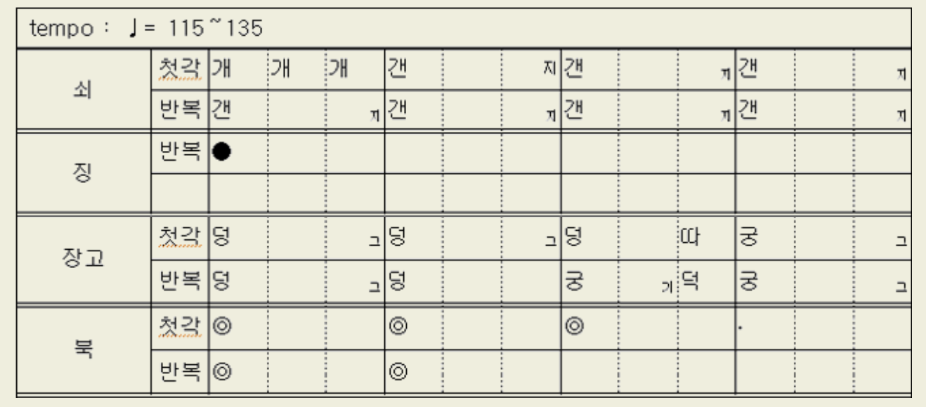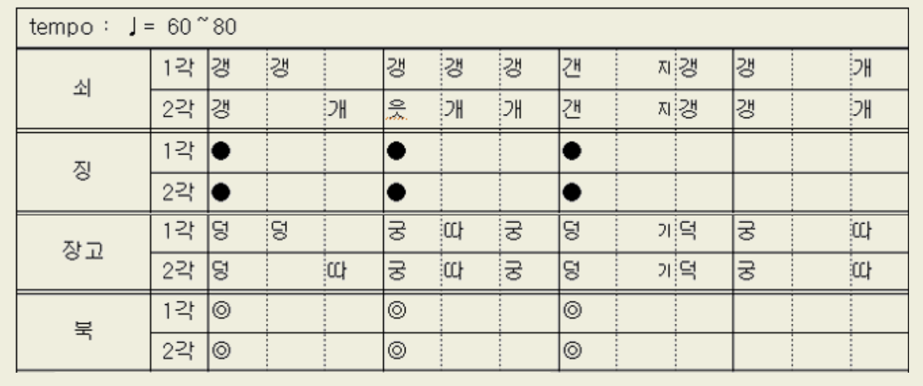 느린 풍류 가락은 3분박 4박자의 느린 한배로 시작하여 약 간 조여가는 느낌이 들도록 연주해야 한다. 풍류가락은 신명을 돋우고자 할 때 가장 많이 쓰이는 가락중의 하나로 여유있고, 넉넉하고, 투박하게 연주하여야 제 맛이 난다. 진의 형태는 원진 형태이며 치배들은 서서히 원진을 돌고, 관객은 판 안에 들어와 허두잽이들과 더불어 흥겨운 춤판을 구성한다.