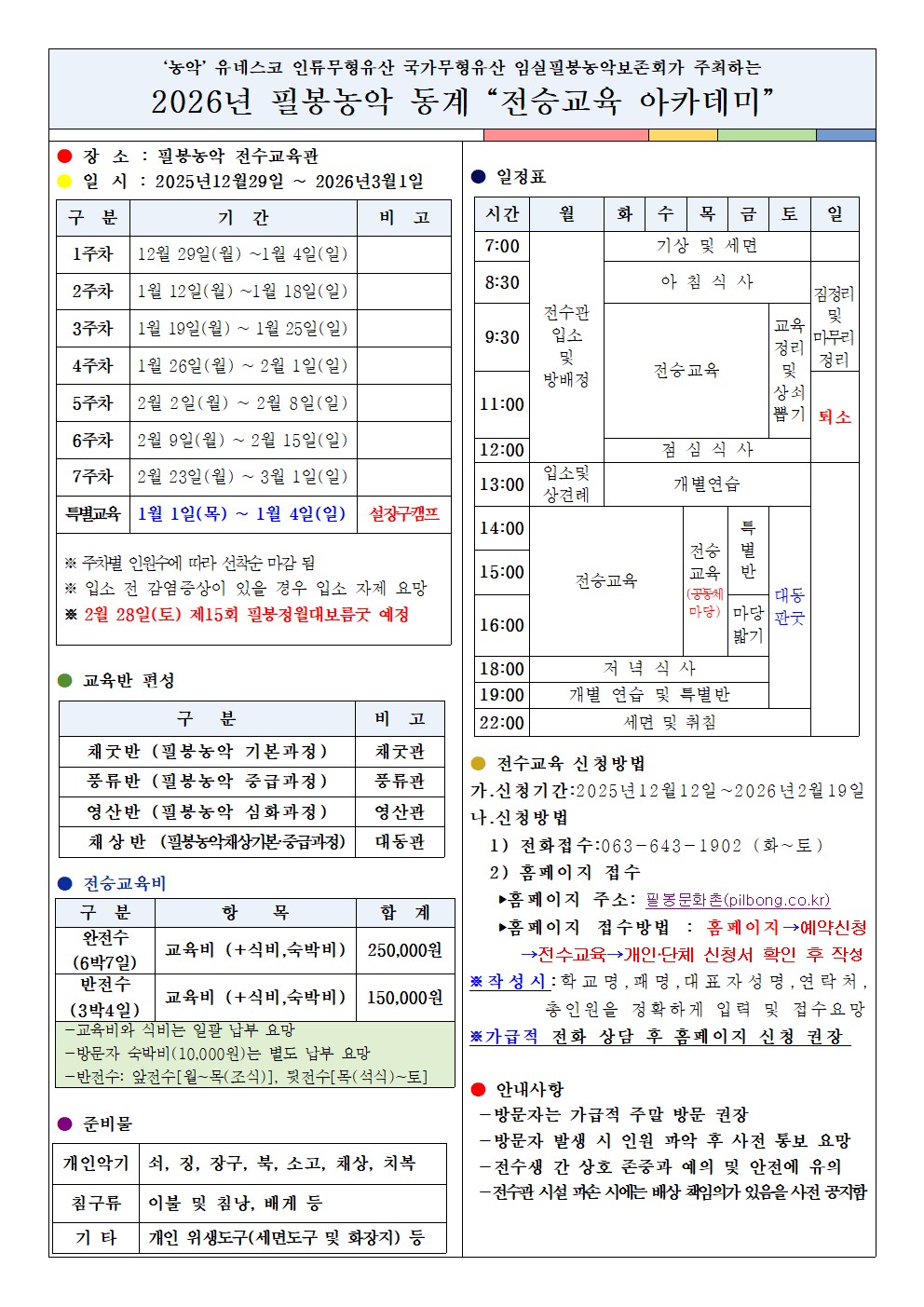 ※ 특별교육 접수시 필봉문화촌 홈페이지(www.pilbong.co.kr) 예약신청 → 설장구 캠프 신청서 작성 ✔️