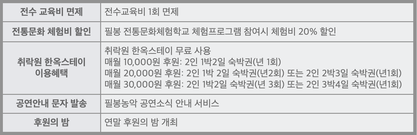 필봉농악 후원회원이 되면 임실필봉농악보존회에서 주최하는 모든 행사의 주인으로서 참석 할 수 있고 아울러 아래와 같은 혜택을 이용할 수 있습니다.