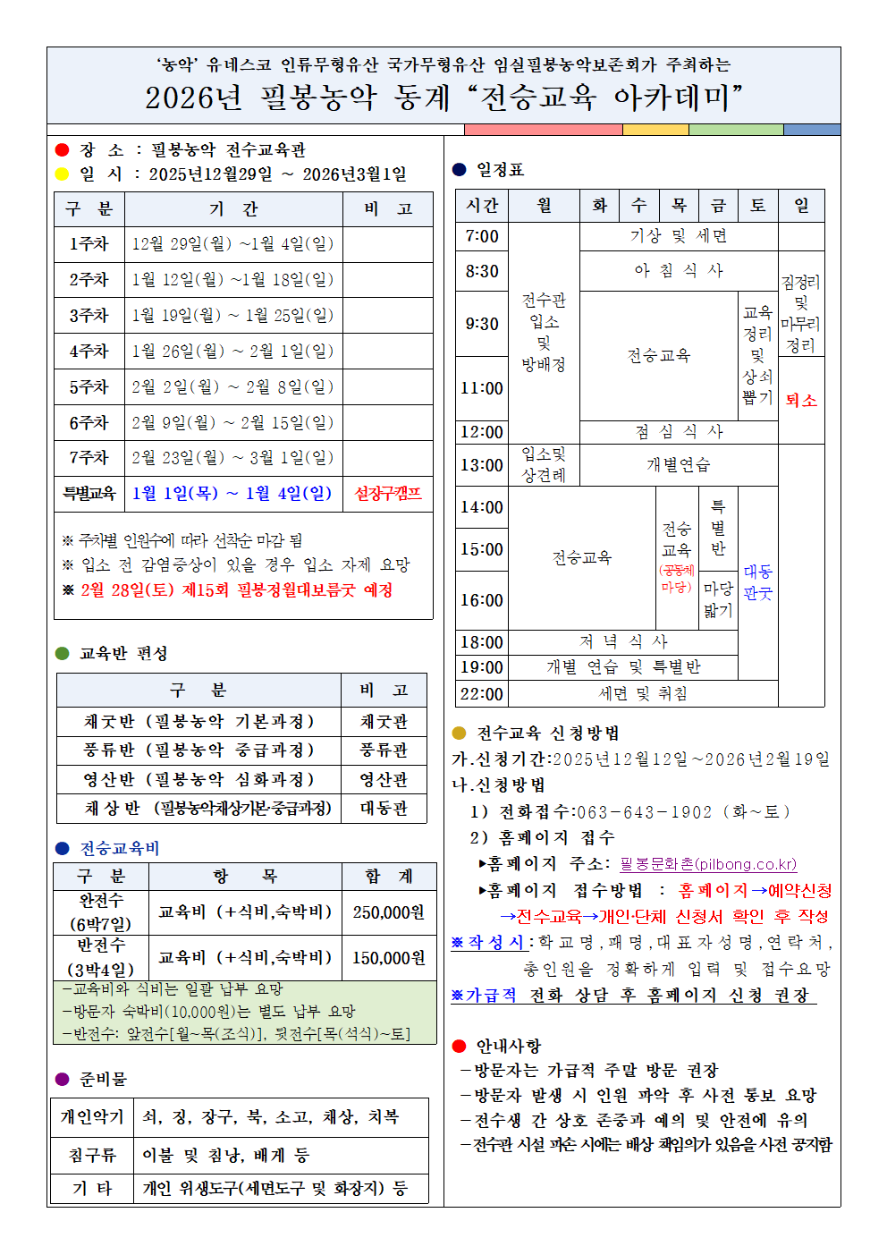 · 수강료는 선금납부를 원칙으로 하며 캠프 및 전승교육이 시작한 이후의 중도 퇴소 및 교육 불참 시 환불되지 않습니다.